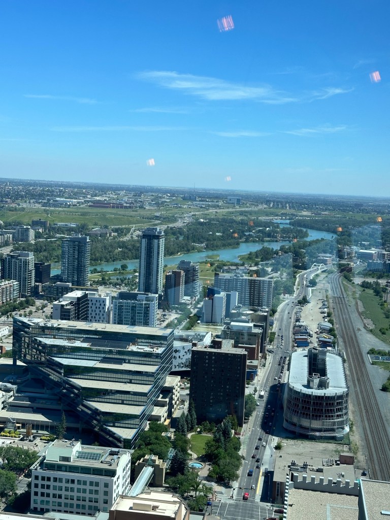 Yesterday, Mark and I rode the C-train again back into Calgary to have brunch at the Calgary Tower. Totally a tourist attraction, complete with 70’s decor! The staff was excellent and attentive, chatting with us about the Stampede, Calgary, Alberta, and anything else we asked.