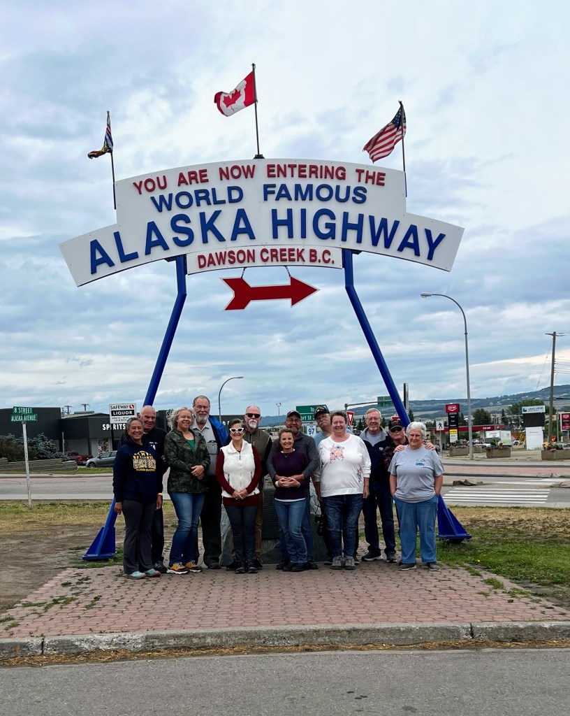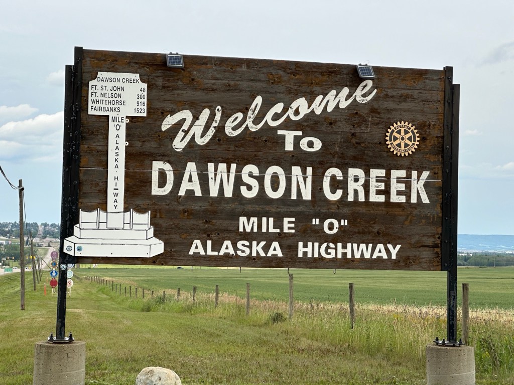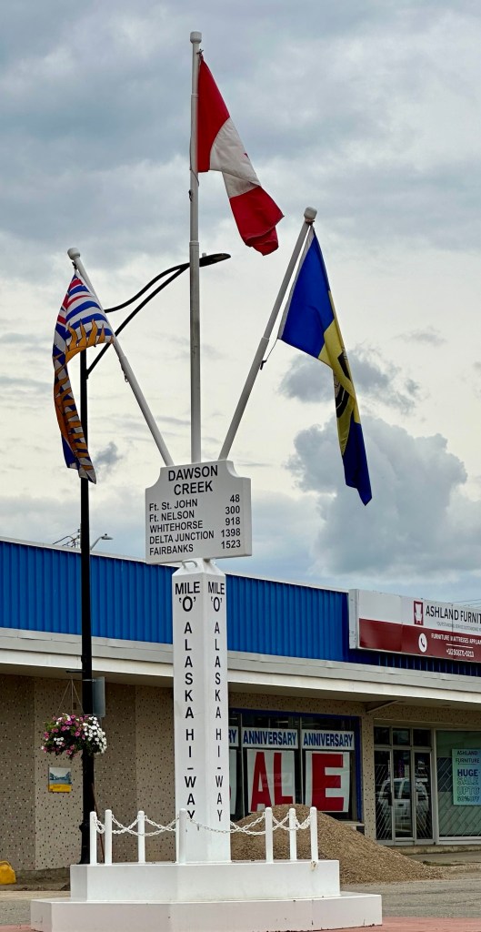 We’ve driven roughly 3500 miles to get to Mile “0” on the Alaskan Highway! The true journey begins now! We’ve entered British Columbia province in Canada and are staying in Dawson Creek at the Northern Lights RV Park. The weather has been chilly with overcast and rain. We’ve now entered the Pacific time zone and days are longer. Morning sunrise is around 5:00 AM and sunset around 10:00 PM.