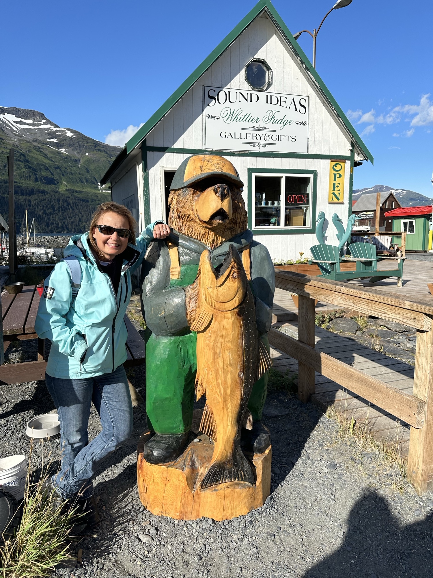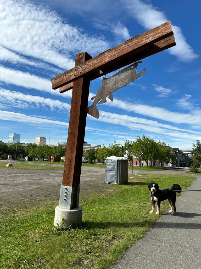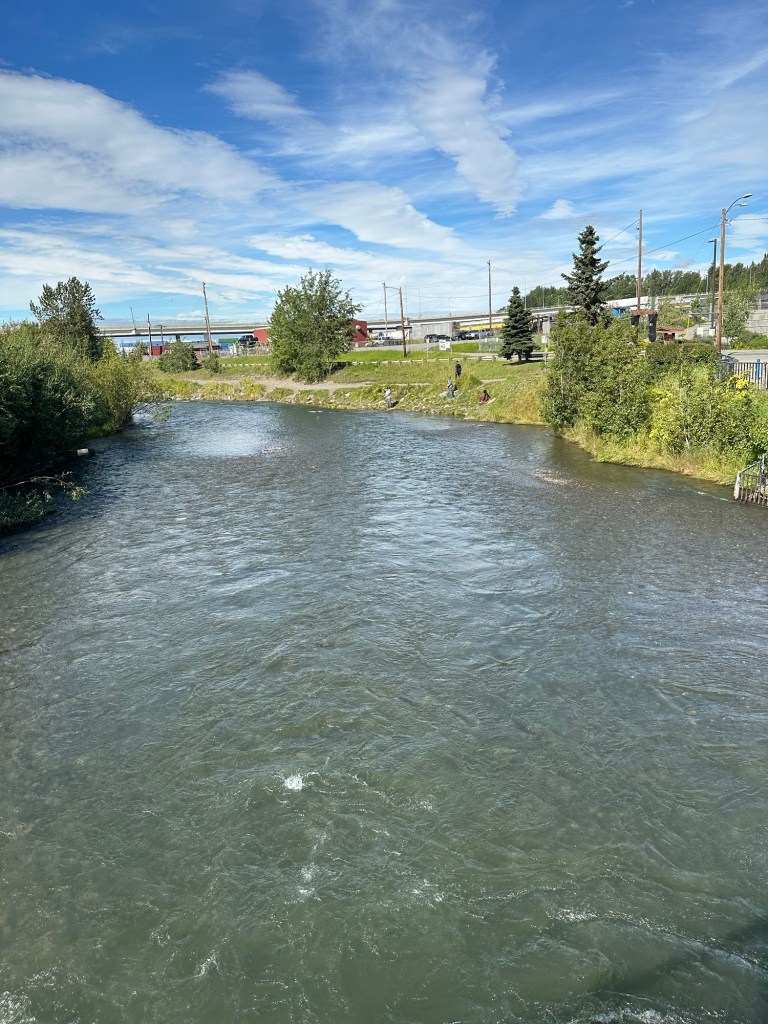 Mark, Timber and I went to see the Ship Creek Salmon Viewing area – which was pretty dismal the day we went. I was expecting a creek full of active jumping salmon, but we saw very few.