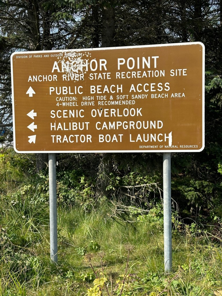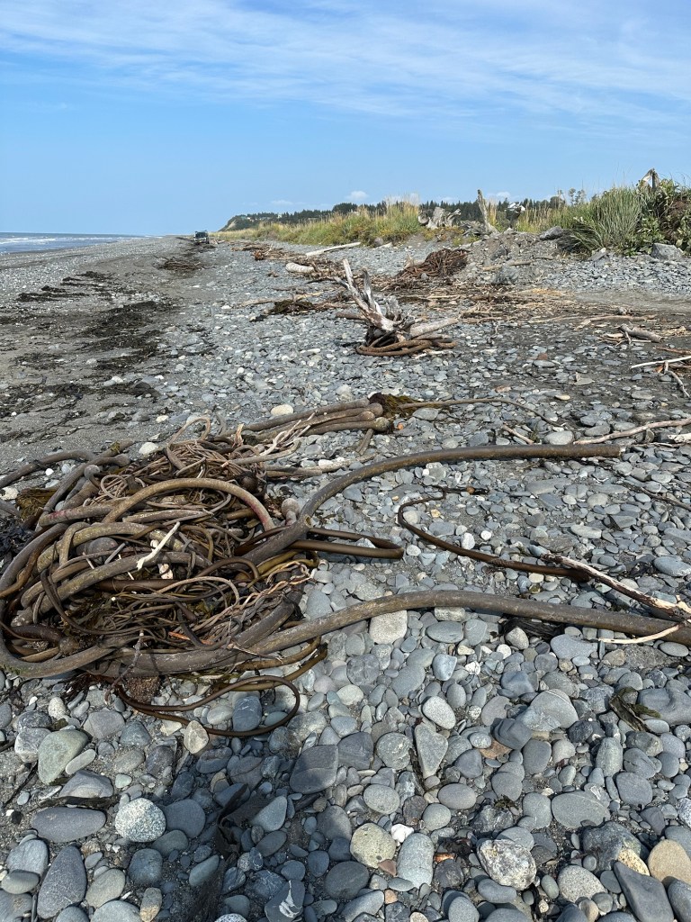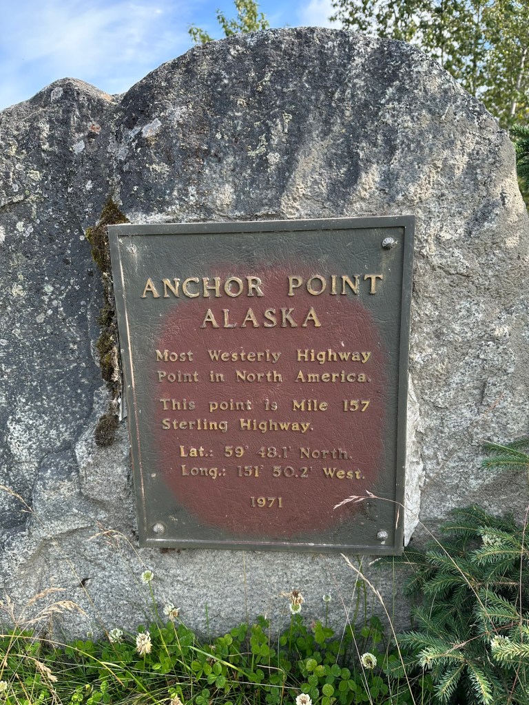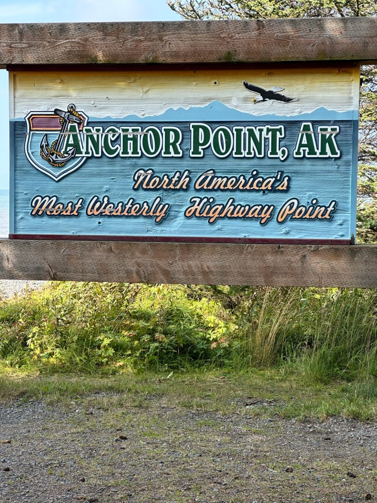 One afternoon, we explored Anchor Point, North America’s Most Westerly Highway Point. Several fascinating discoveries awaited us… including the tentacled-like bull kelp that had washed ashore on the pebbled beach, seeing modified front-end loaders used to launch Halibut fishing boats into the sea, and looking out across Cook Inlet to try to see the volcanoes in the Lake Clark National Park & Preserve