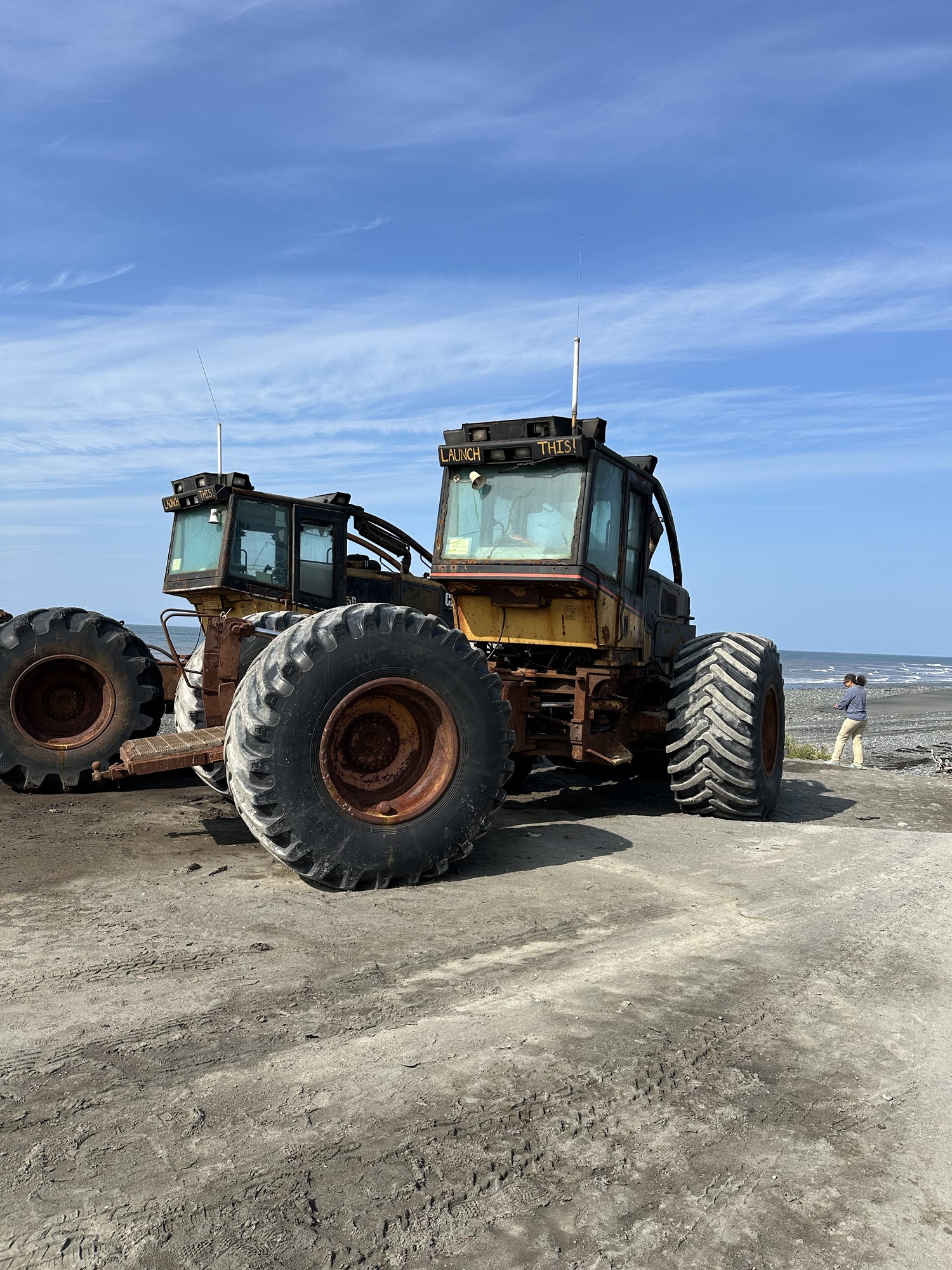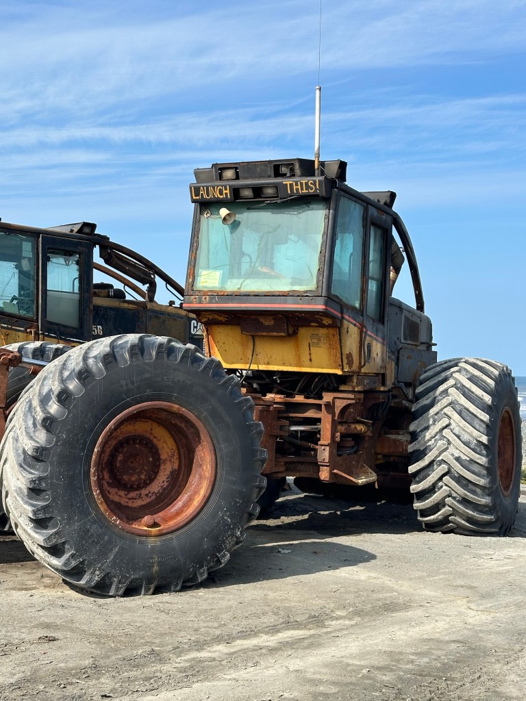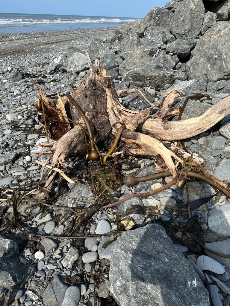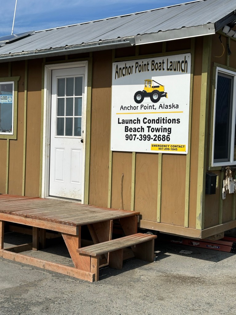 One afternoon, we explored Anchor Point, North America’s Most Westerly Highway Point. Several fascinating discoveries awaited us… including the tentacled-like bull kelp that had washed ashore on the pebbled beach, seeing modified front-end loaders used to launch Halibut fishing boats into the sea, and looking out across Cook Inlet to try to see the volcanoes in the Lake Clark National Park & Preserve