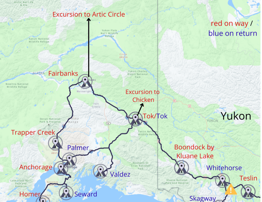 From Valdez, we head back up to Tok, then back on the Alaska Highway for a boondock night and then a few nights in Whitehorse (Yukon Territory) before our last Alaskan stop in Skagway. After that, we begin making our way back through Canada to the Washington border. I’ll post a new map in the next blog.