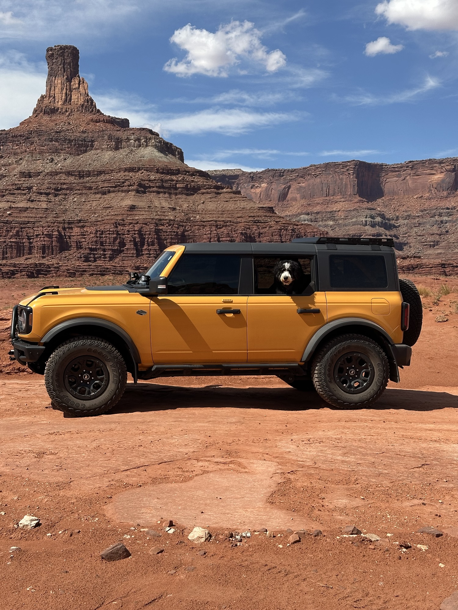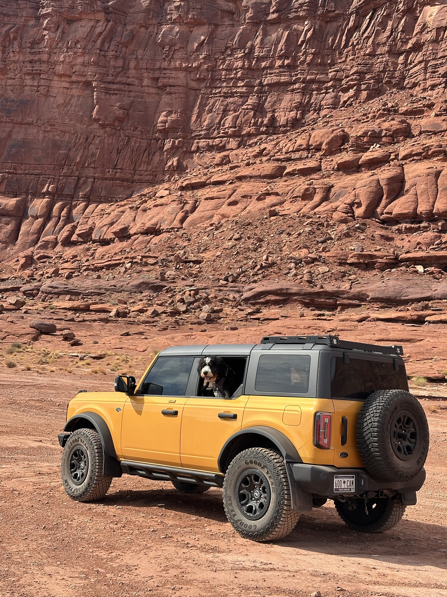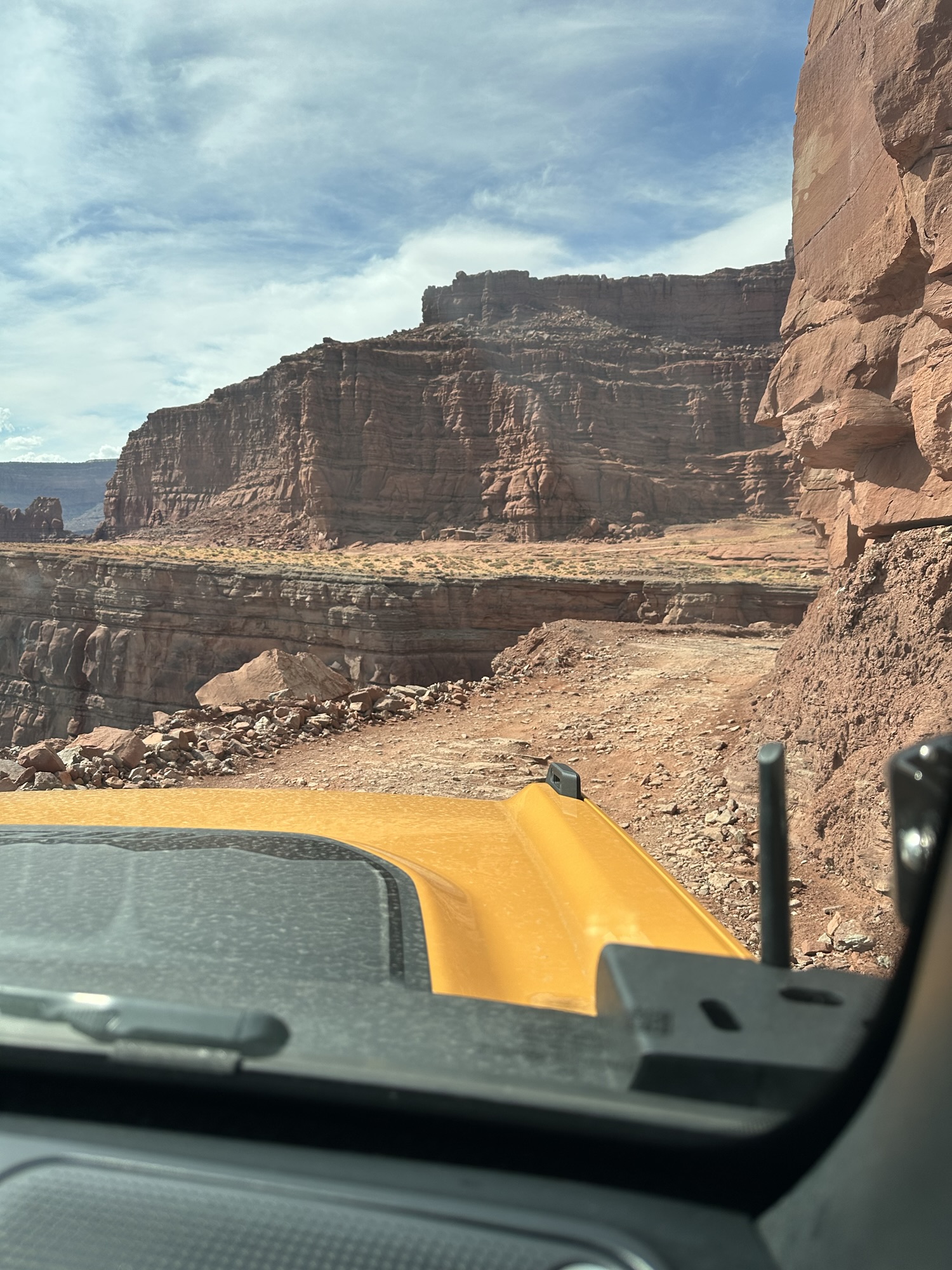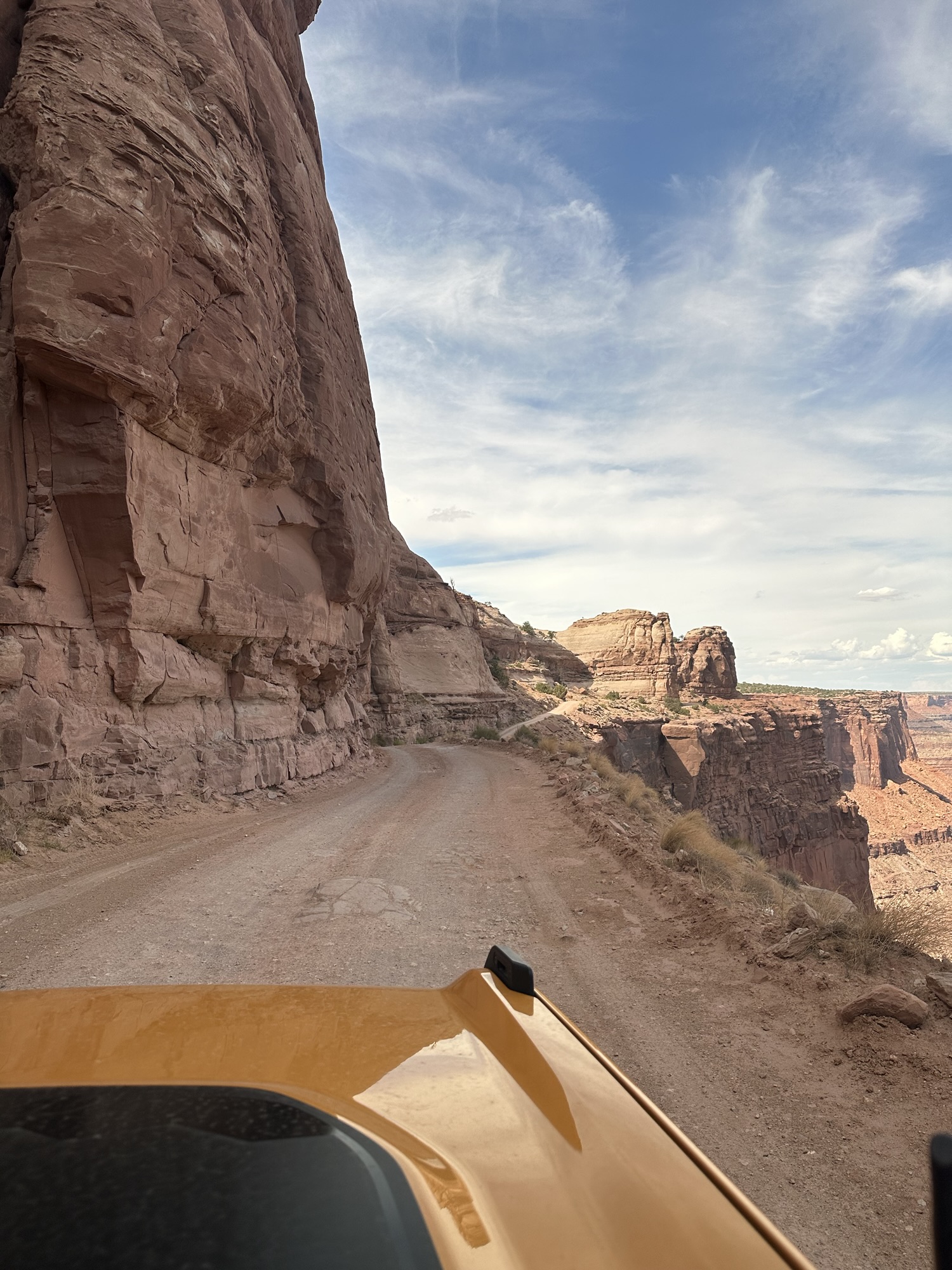 Things were going well enough until we sighted the cliff wall. We ascended four miles of tight narrow switchbacks climbing a 1,500ft massive sandstone cliff to exit the canyon. I would not let Timber hang his head out the window for fear it may tip us over the ledge! Most of the harrowing section of the trail is in the Island of the Sky district of Canyonlands National Park and you exit (or enter) the trail near the Visitor Center. The original trail was made by Native Americans to get from the river to the top of the mesa. Sheep herders then used it to move their flocks for winter. Before becoming part of Canyonlands, the trail was slightly widened to accommodate trucks hauling uranium to market.