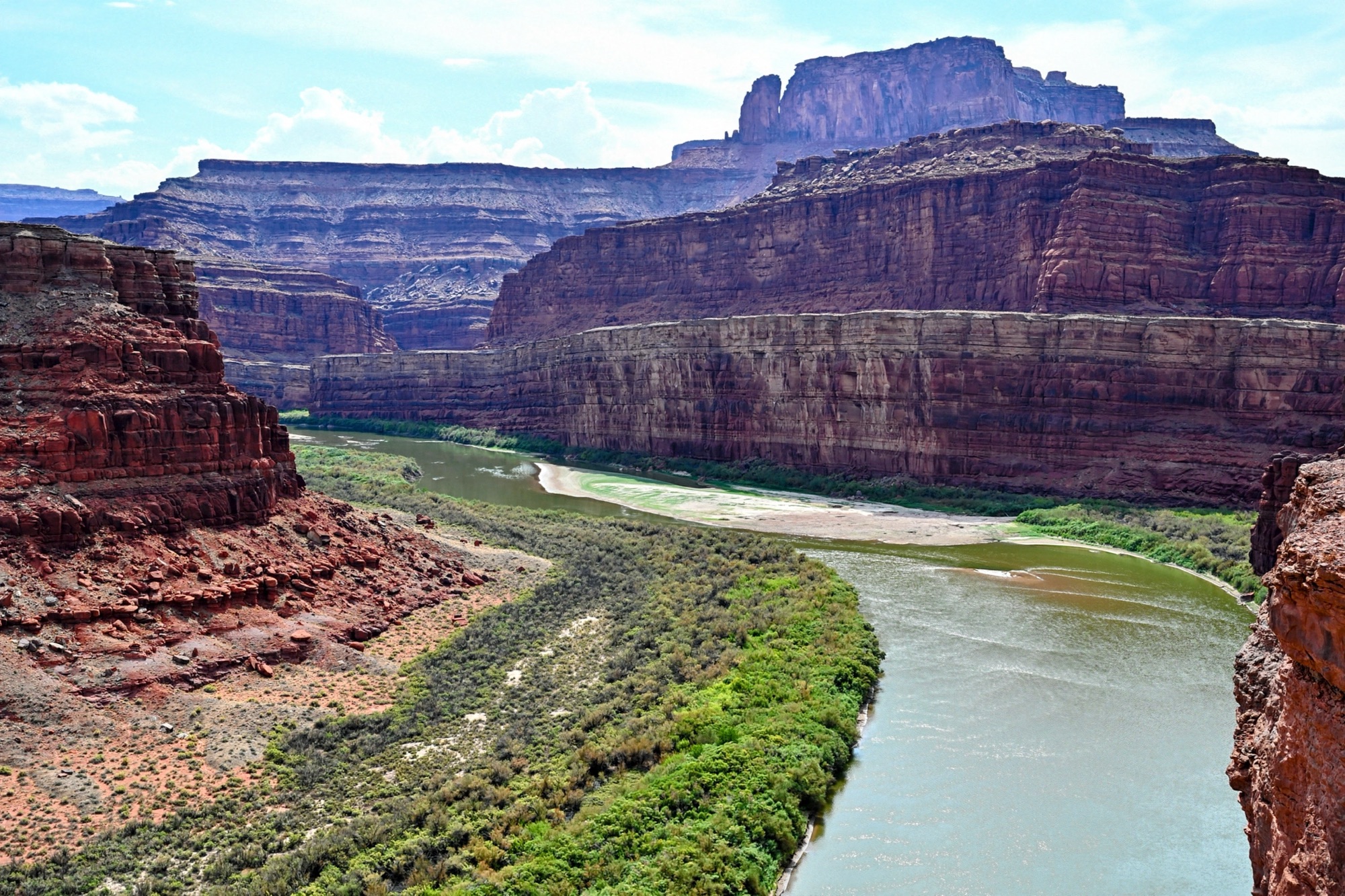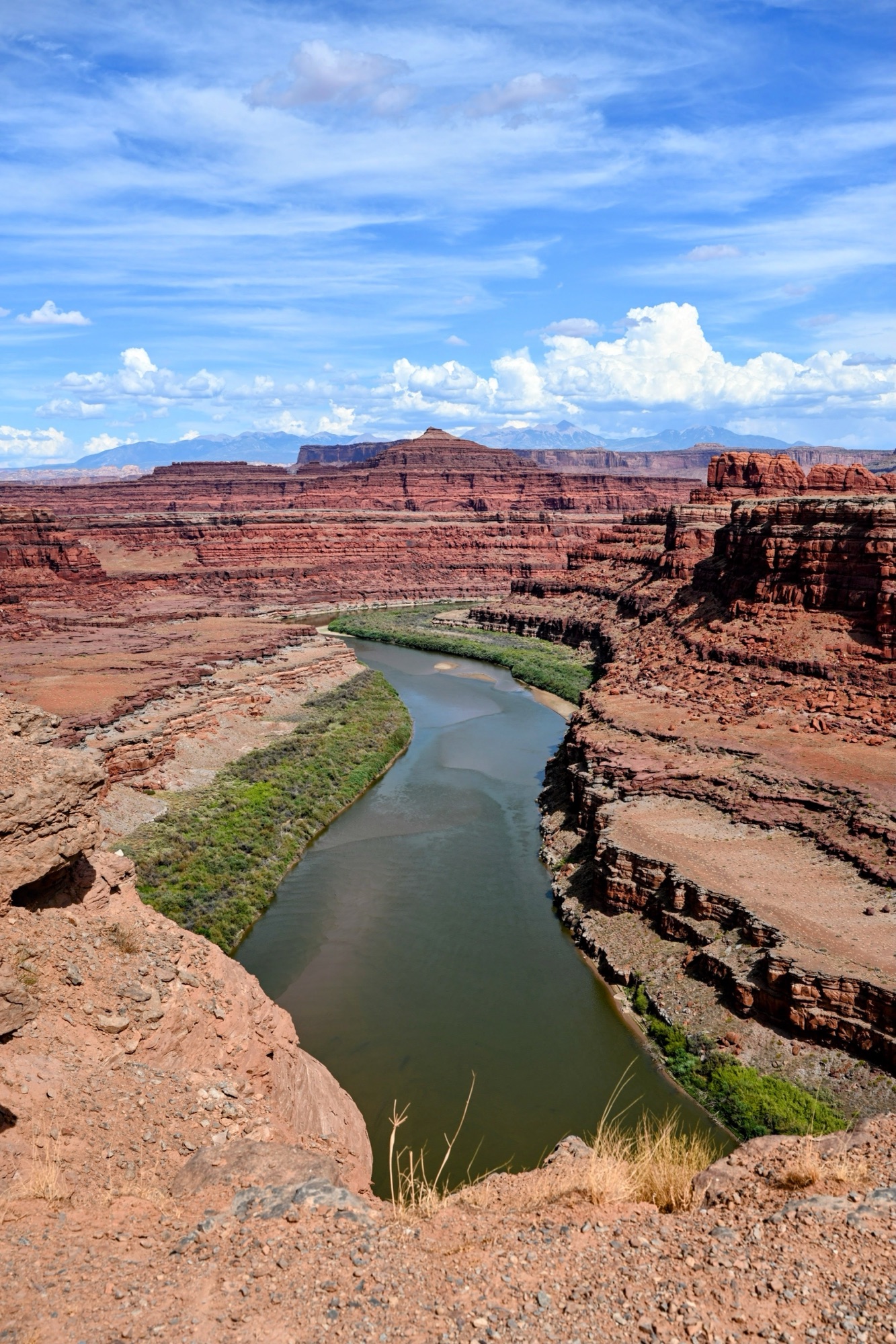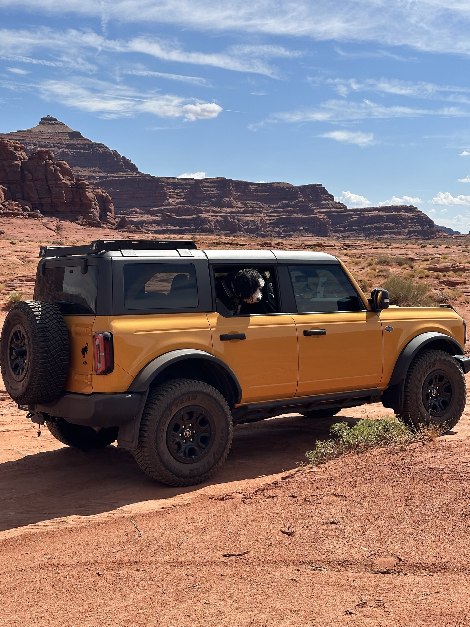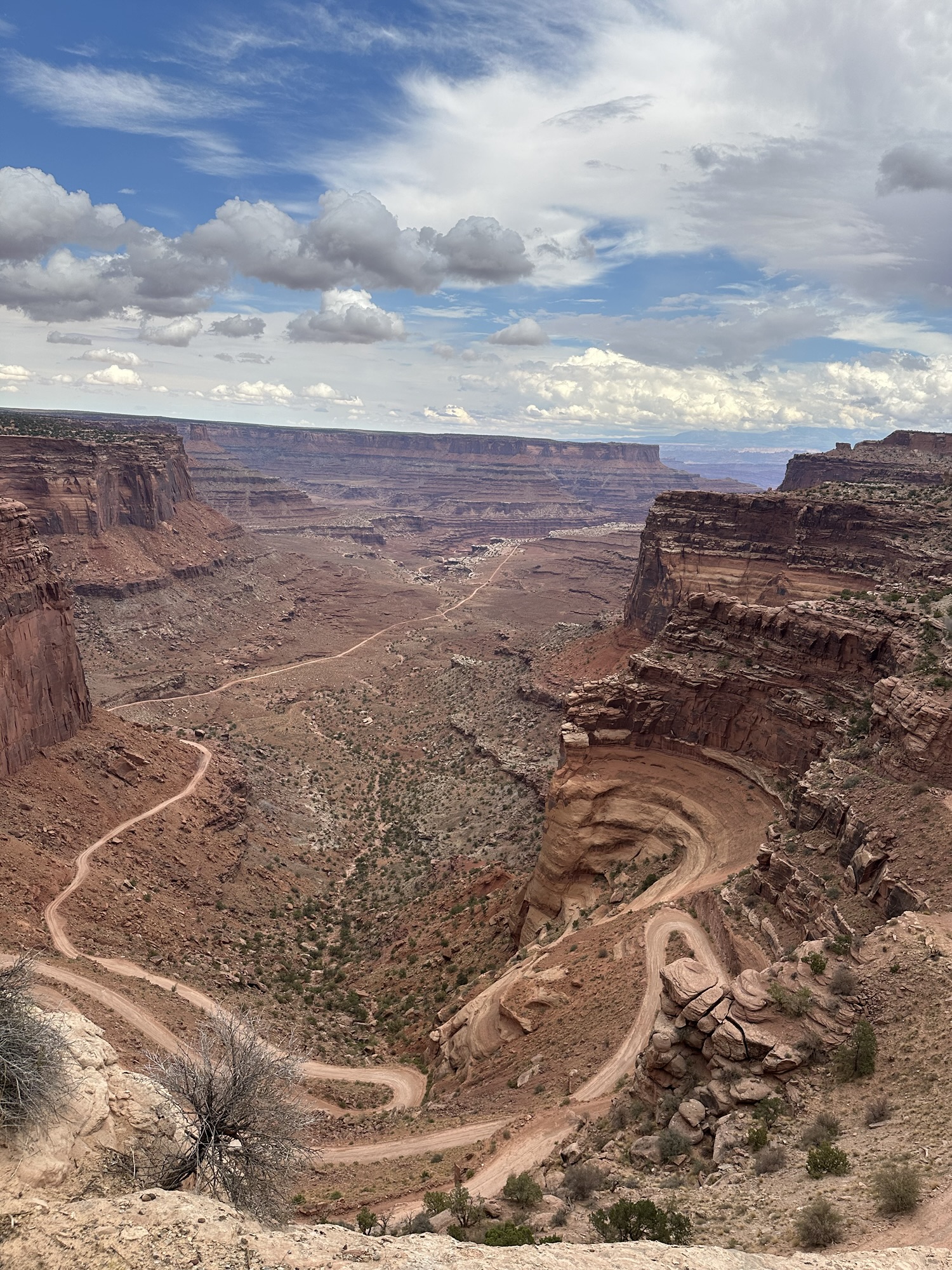 Things were going well enough until we sighted the cliff wall. We ascended four miles of tight narrow switchbacks climbing a 1,500ft massive sandstone cliff to exit the canyon. I would not let Timber hang his head out the window for fear it may tip us over the ledge! Most of the harrowing section of the trail is in the Island of the Sky district of Canyonlands National Park and you exit (or enter) the trail near the Visitor Center. The original trail was made by Native Americans to get from the river to the top of the mesa. Sheep herders then used it to move their flocks for winter. Before becoming part of Canyonlands, the trail was slightly widened to accommodate trucks hauling uranium to market.
