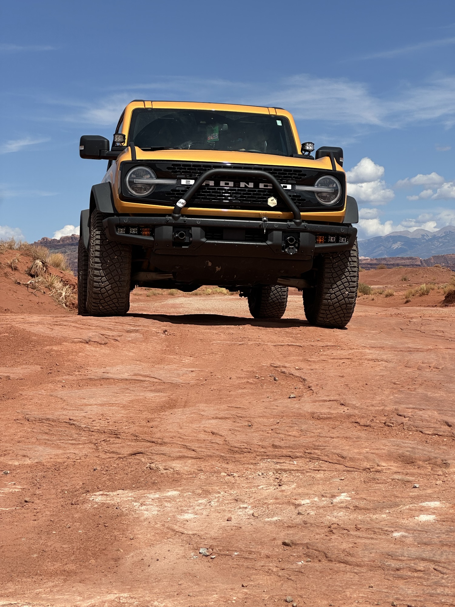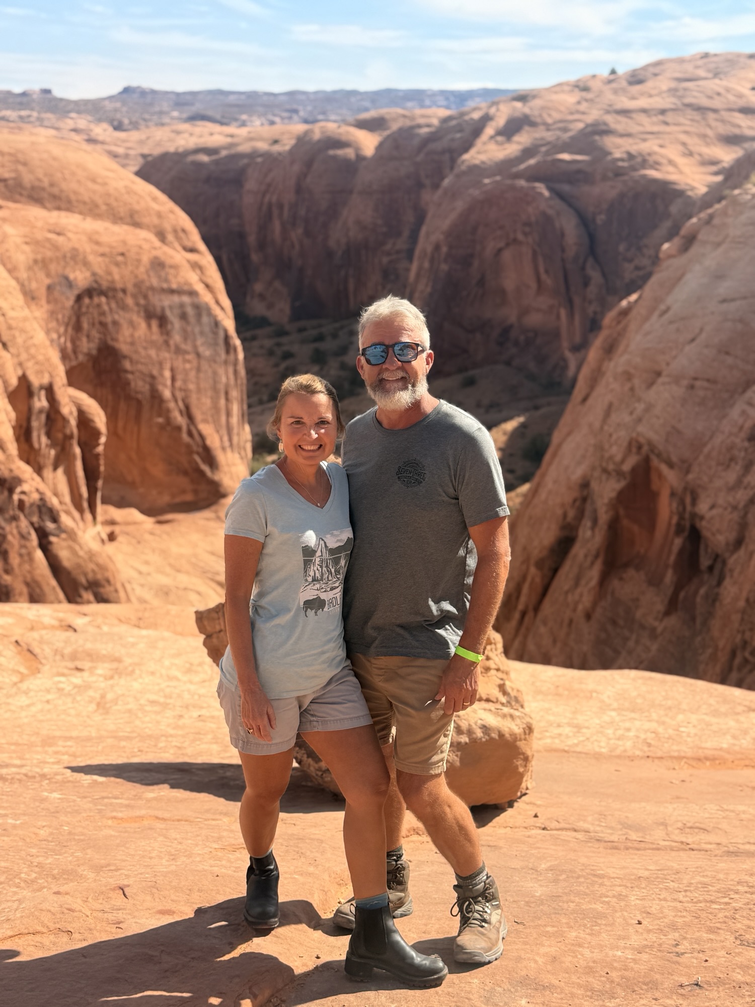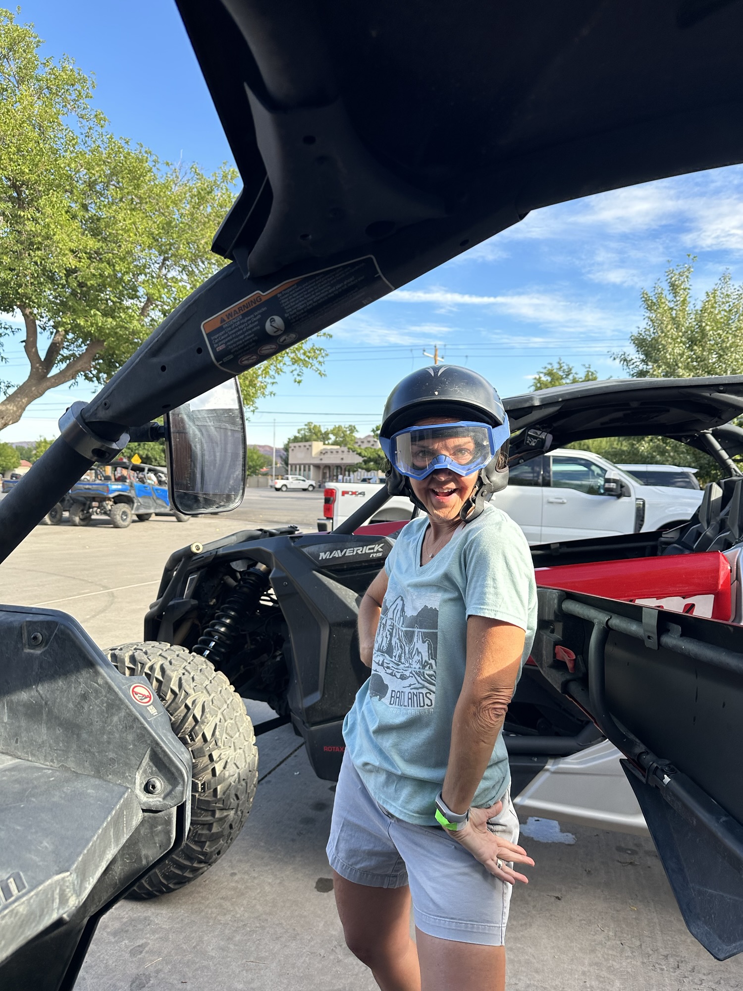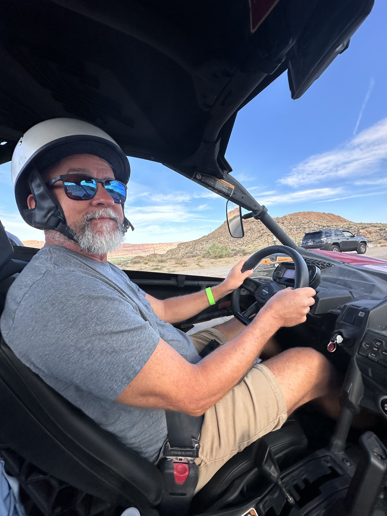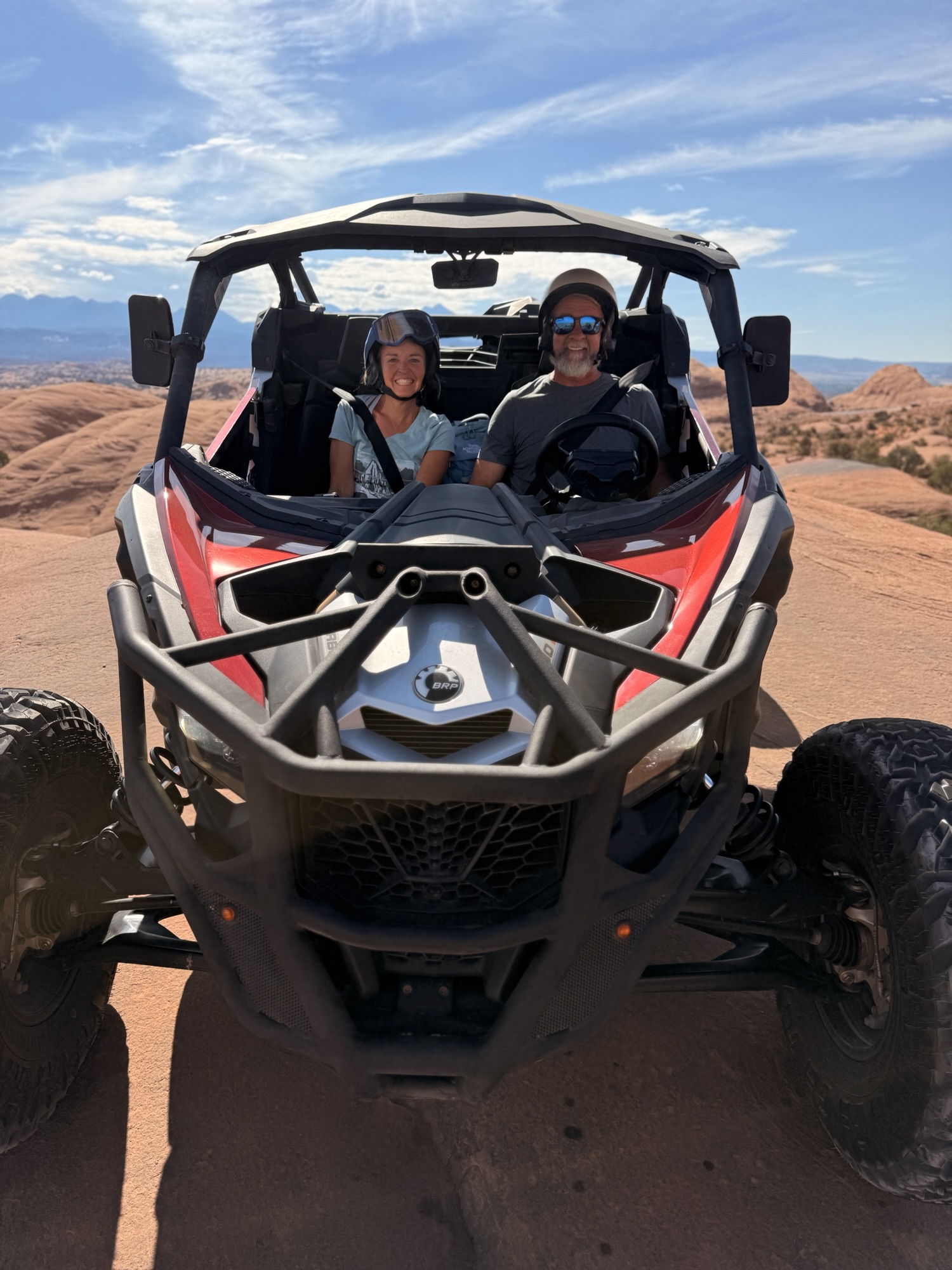 This day is the whole reason why we came to Moab! First half of the day was going to be dedicated to off-roading in side-by-sides with a guide on some of Moab’s most famous trails. The afternoon was dedicated to an off-road experience in Cheeto (using FunTreks 4-Wheel-Drive Trails book as our guide). We arrived early at High Point Hummer & ATV to meet our professional guide, JP, and go over safety rules for driving our Can-Am X3 during our three-hour Hell’s Revenge & Fins N’ Things guided adventure. For those who do not live in the off-roading world, Hell’s Revenge is the name of the signature trail for Moab’s 4-wheel community and is one of the most famous trails in the US. It is a 6.5 mile round-trip trail in the Sand Flats Recreation area and consists mostly of slickrock with bits of sand and rock ledges. It is labeled as a double black diamond trail. You warm up on the nearby 9.4 mile, one-way Fins N’ Things trail, being only a single black diamond. Needless to say, I was way out of my comfort zone as soon as we hit the first climb and all I could see was sky, while Mark did nothing but hoop and holler with delight the entire time! On the few times I opened my eyes, we had gorgeous views of the Colorado River and the surrounding canyons. I am attempting to upload two short videos, not sure if they’ll play properly, so I’ve also included a few photos!