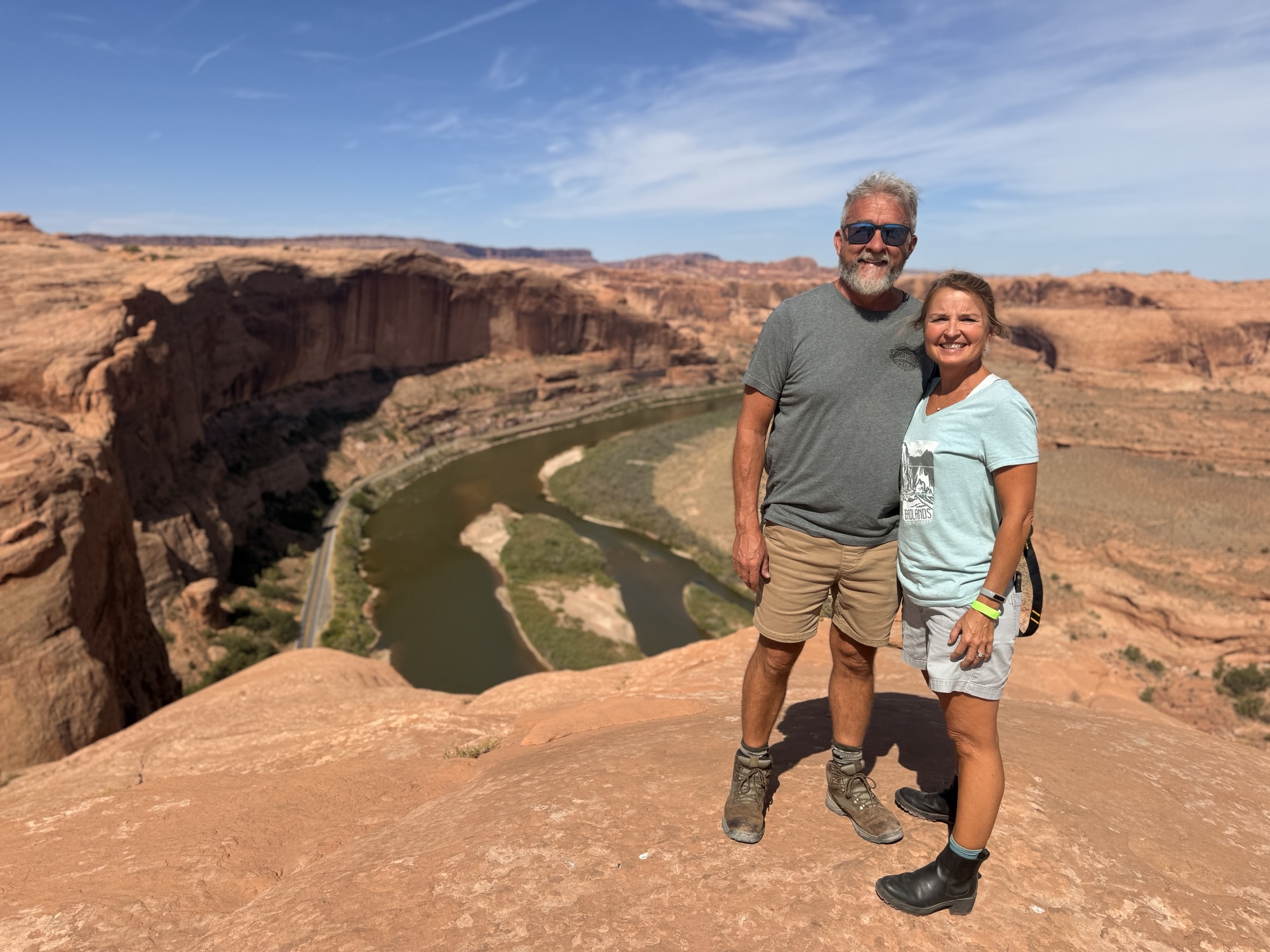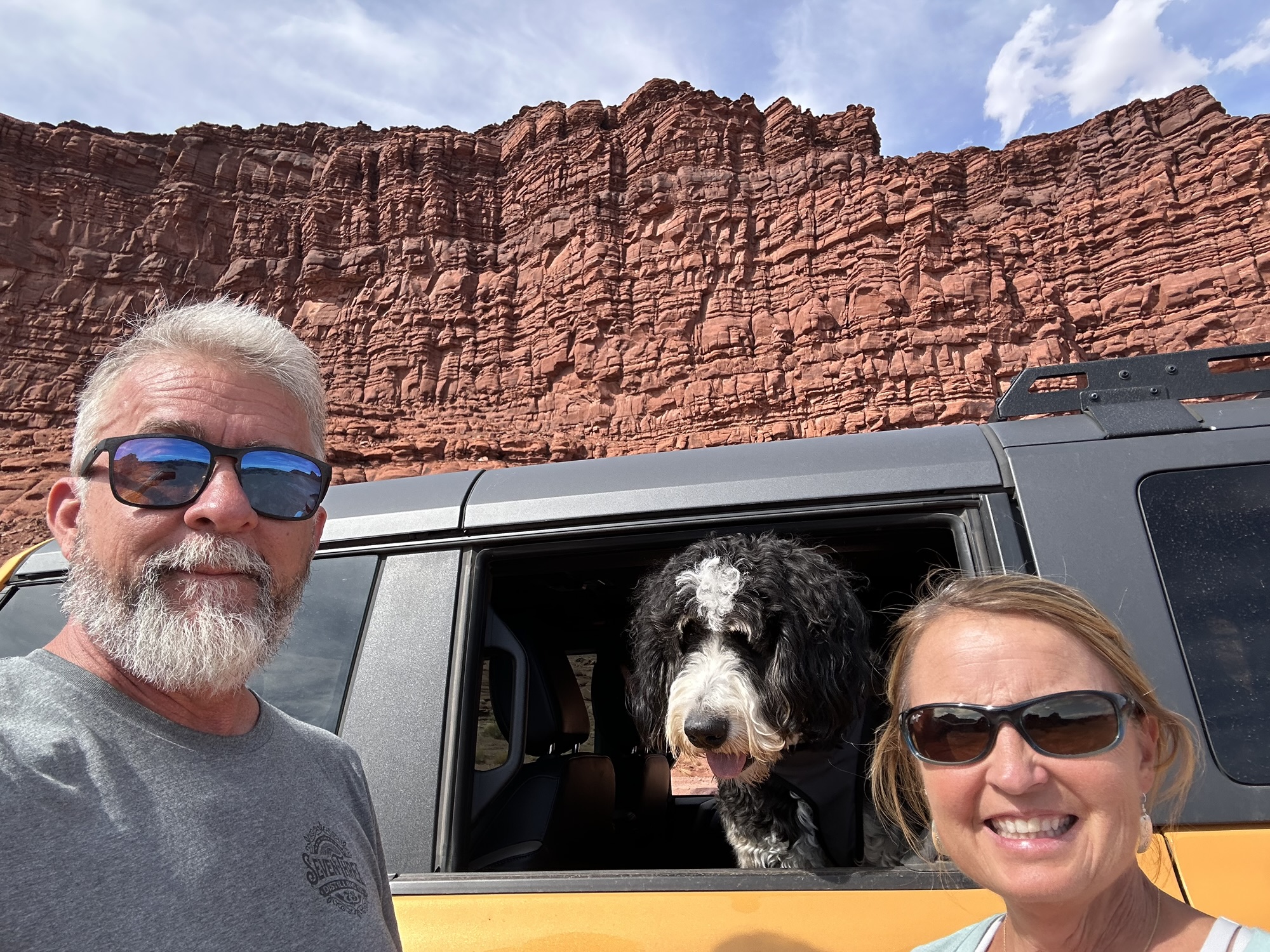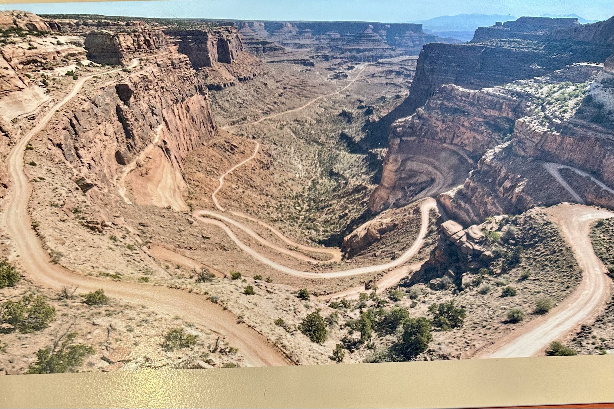 After having a recovery lunch at Dewey’s Restaurant & Bar, where Mark ordered a cheese burger and I chose the Cuban Panini, we came back to the rig to get Timber and Cheeto for our next adventure. Only after talking to the Canyonlands Park Ranger the following day did we learn that where we began off Potash Road is labeled a blue trail, but when you reach the Shafer Trail Switchbacks it turns to a black diamond trail. The Potash side was rough, but we used the guidebook (which oddly, didn’t show us the rating or perhaps we mistakenly overlooked it) to note our turns and check points. We found the spot for the ending scene where Thelma & Louise drive off the cliff.