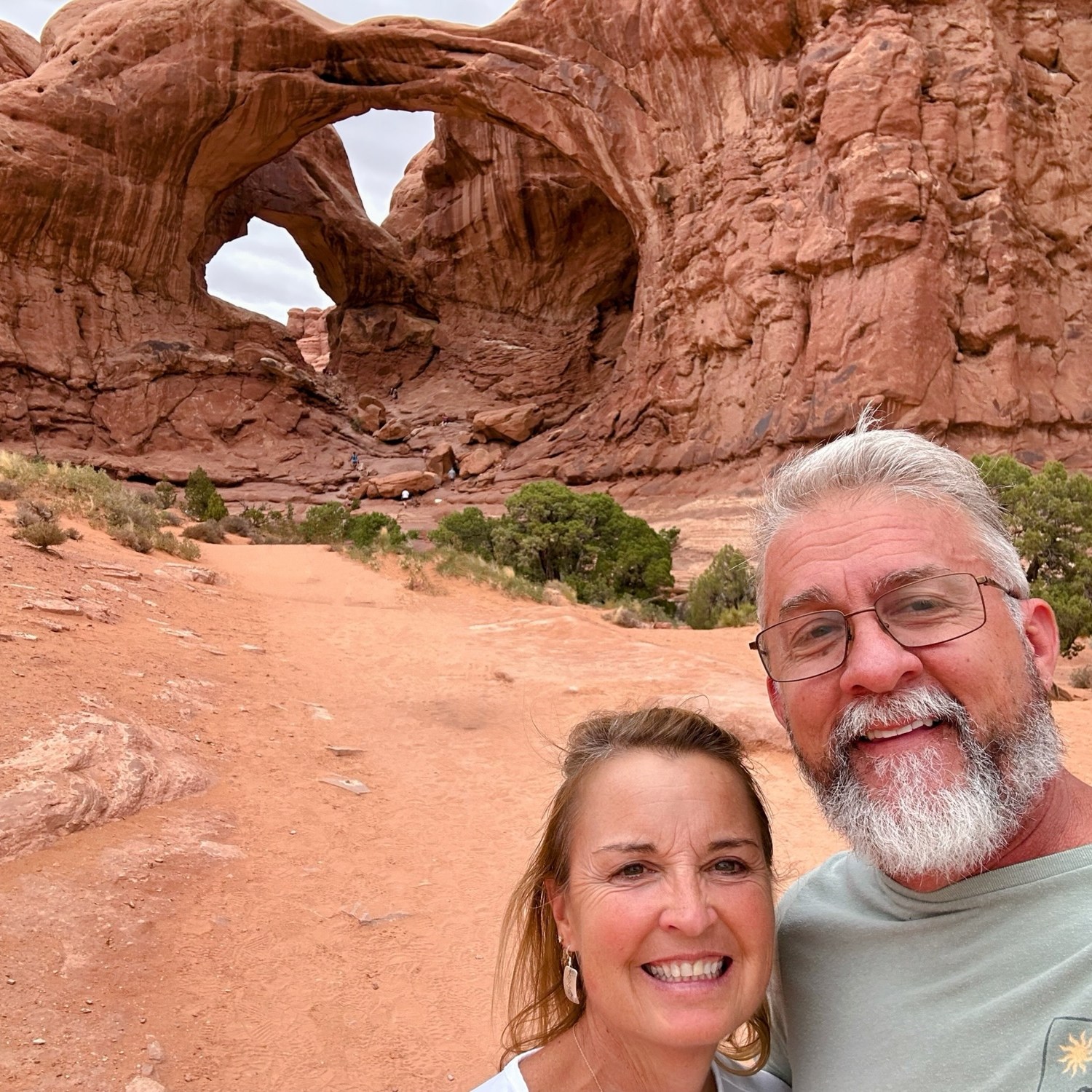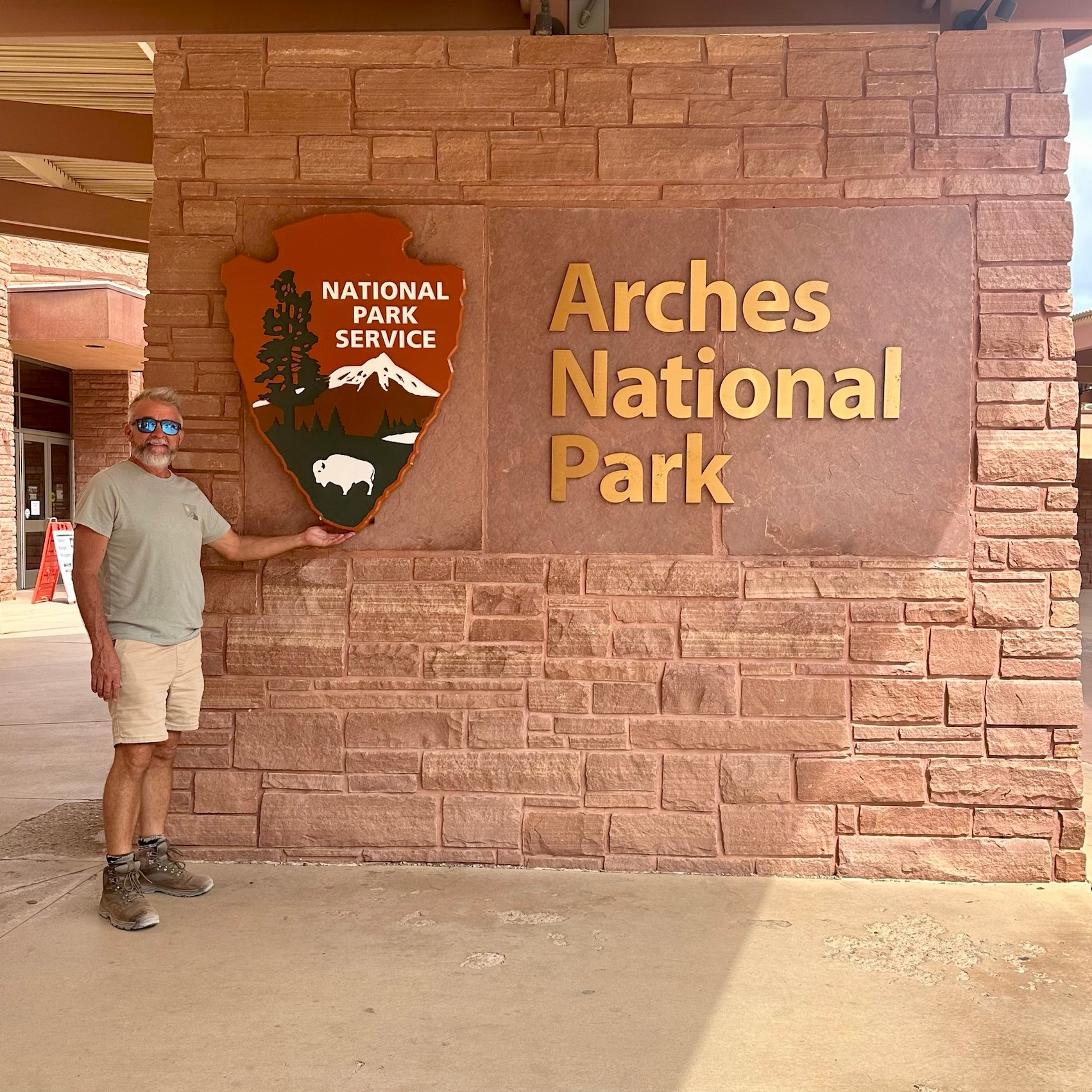 I’m not nearly so eloquent a writer to capture in words the vastness and desolate beauty of this place, nor am I a good enough photographer to capture it in pictures. So, I’ll just recount our day. Fun factoid I learned in the Visitor Center: In 1929, President Herbert Hoover signed a presidential proclamation protecting over 4500 acres of what would become Arches National Park under President Nixon in 1971. With only 18-miles of road, this park is easily doable in a day. Mark only agreed to two hikes, and I knew one had to be to see Delicate Arch, which meant the other would have to be shorter and less climbing or he wouldn’t do Delicate Arch by the time we got to that area of the park. The temps were hovering around high 90’s to lower 100’s. With his core body temperature being so much warmer than mine, I knew I couldn’t push him. We stopped for picture taking at all the famous rock formations, such as Park Avenue, the Three Gossips and Courthouse Towers. We did short little walks to Balanced Rock, North/South Window Arches and the Double Arch, and he seemed to enjoy the strolls. The only discouraging aspect was some lady had her dog on the strictly ‘no dog’ trail. “Privileged Folks” like her give all dog owners a bad name and are the reason for so many ‘no dog’ rules these days.