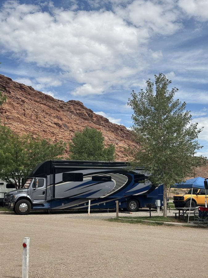 We arrived at Sun Outdoors – Arches Gateway (as they have three Sun Outdoors here) and were greeted warmly. I’m impressed with how many amenities they’ve been able to pack into their small space… a pool and hot tub, a playground, tether ball, separate chess and checker courts, putting green, two enclosed dog “parks” (though one is more the size of a dog pen), two picnic pavilions, rows of cabins, a nicely done area for tent campers, an “airstream only” section, and of course the requisite bath houses, laundry facilities, and more. Each site is set so you pull in opposite way of each other, which allows for a bit more privacy in very tight spaces. Our shared green space included two picnic tables, two small shade trees and a charcoal grill. The tables and trees were at each end. You basically had to be good neighbors and super friendly. After getting Jack settled, we took time to check out our “things to see and do” list and prioritized each day’s activities. Then we headed to the pool with drinks in hand!