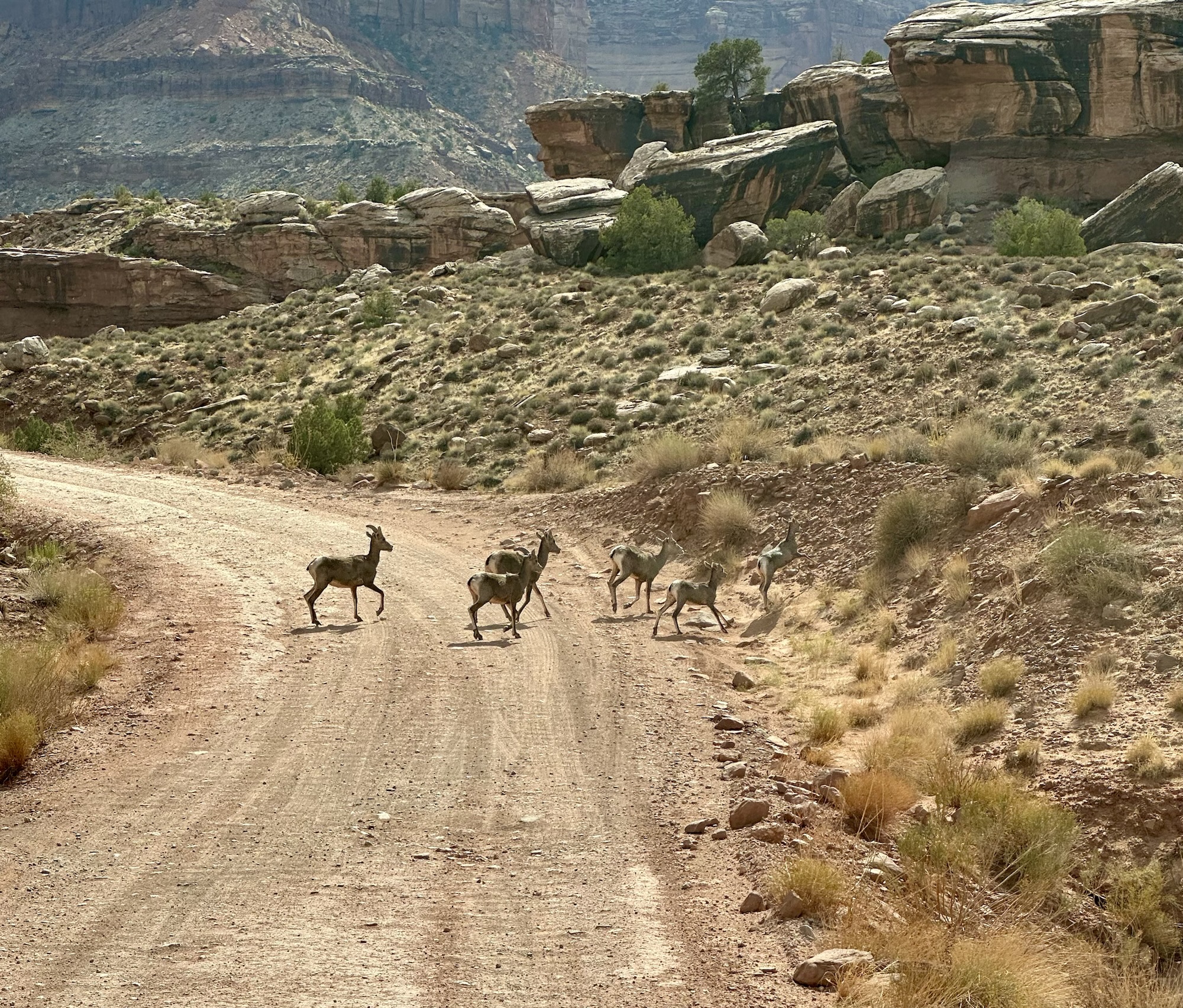 We stopped for a few pics with Timber and Cheeto and then we entered the backcountry of Canyonlands. We spotted Desert Big Horn Sheep, which the Park Ranger informed us are much smaller than the Rocky Mountain Big Horn Sheep and are quite rare to find in the park. I had asked him to look at my photo because I thought they might be sick due to their small size. They looked like deer with oddly formed horns instead of antlers.