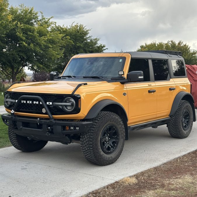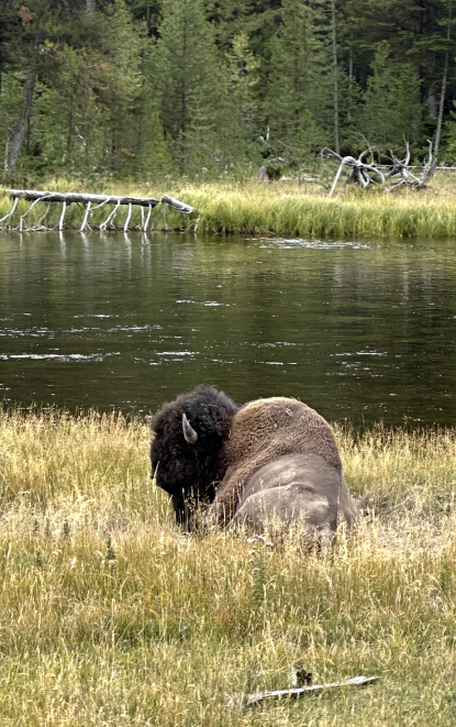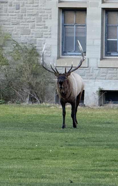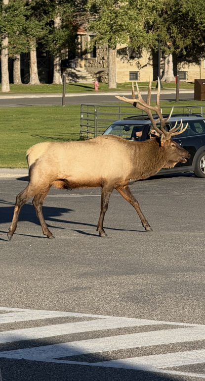 As we exited the dining room with Timber’s ‘to-go’ meal, we heard the unmistakable trumpet of a bull elk. The park ranger was warning tourists that this guy was quite aggressive and just last week had been in a pretty big fight with another male elk (and easily won!). Number 24 (his number is a red tag on his right ear) has four lady elks that ‘hang out’ near the hotel. The Park Ranger told us to keep Timber in the Bronco, as #24 would go after him. He passed right near us but conveniently butted a passing car out of his way.